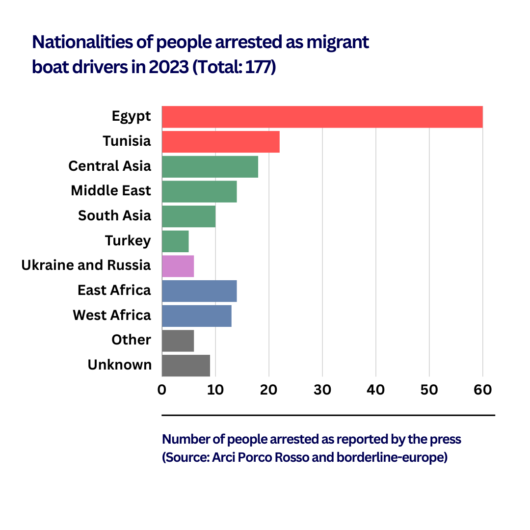 Im Jahr 2023, wie auch schon in den Jahren 2021 und 2022, zielten die Behörden insbesondere auf ägyptische Staatsbürger*innen ab und identifizierten mindestens 60 als Kapitän*innen. Ganz anders verhielt es sich vor dem Jahr 2020, als ägyptische Staatsbürger*innen nicht mehr die am meisten kriminalisierte Nationalität darstellten. Seit dieser Trendwende 2020 wurden etwa 300 ägyptische Bürger*innen festgenommen, von denen sich die meisten wahrscheinlich noch immer in italienischen Gefängnissen befinden.